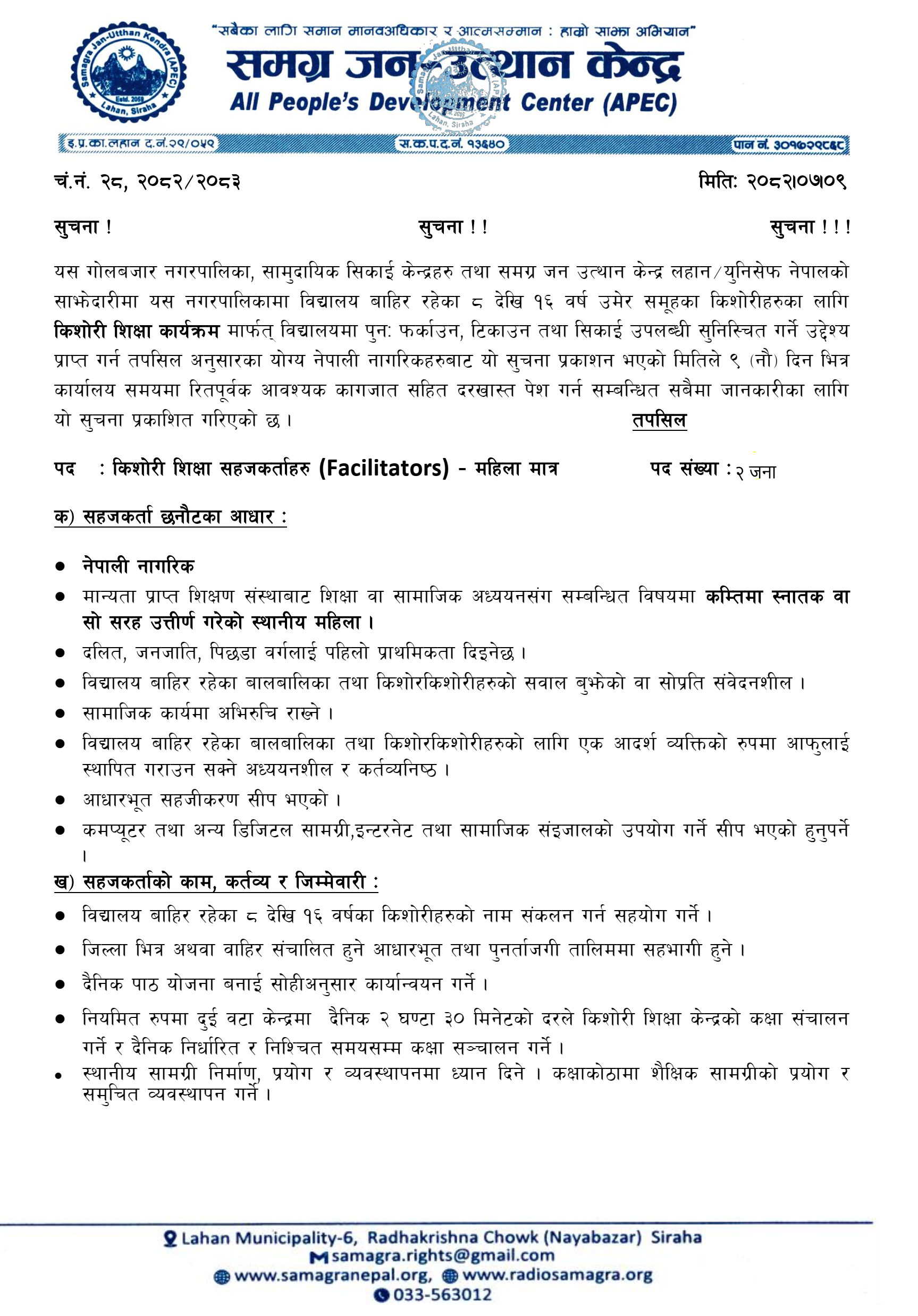 » किशोरी शिक्षा कार्यक्रम सम्बन्धमा ।