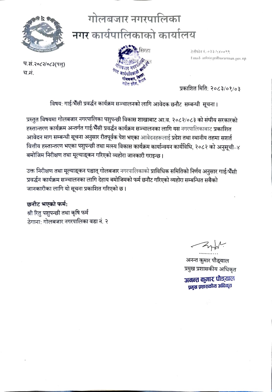 गाई भैँसी प्रवर्द्धन कार्यक्रम सञ्चालनको लागि आवेदक छनौट सम्बन्धी सूचना ।