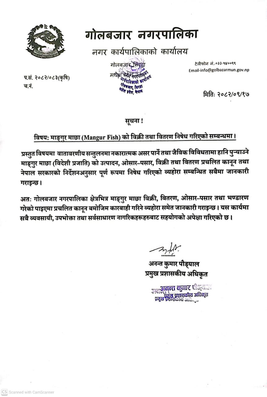 » माङ्गुर माछा (Mangur Fish) को बिक्री तथा वितरण निषेध गरिएको सम्बन्धमा ।