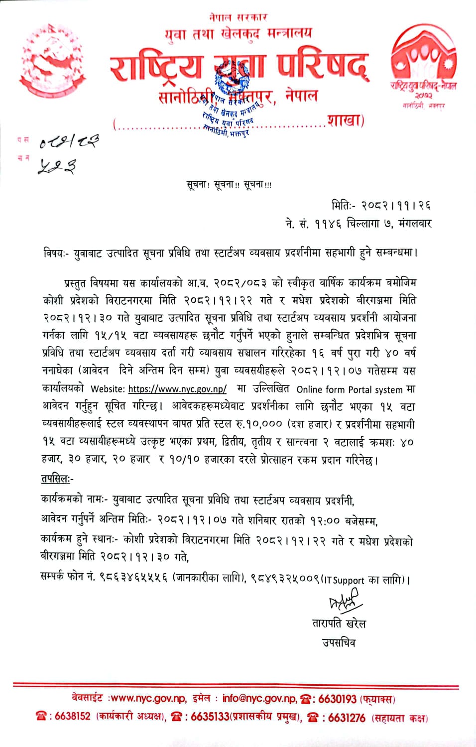 युवाबाट उत्पादित सूचना प्रविधि तथा स्टार्टअप व्यवसाय प्रदर्शनीमा सहभागी हुने सम्बन्धमा ।
