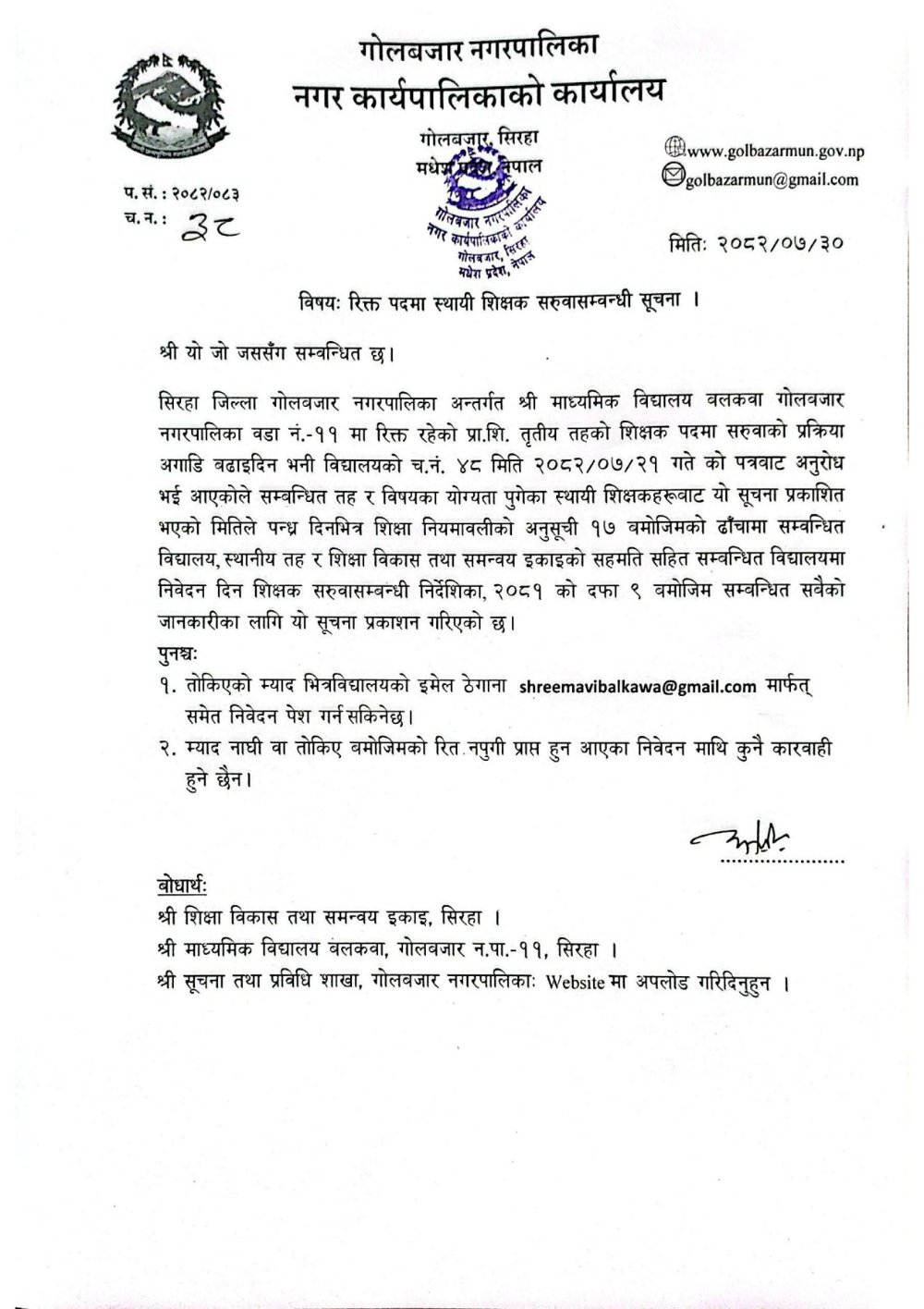 रिक्त पदमा स्थायी शिक्षक सरुवा सम्बन्धी सूचना ।