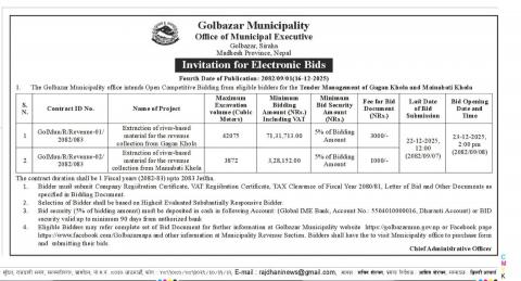 » नदीजन्य पदार्थ उत्खनन् तथा संकलनको लागि बोलपत्र अह्वान सम्बन्धी सूचना ।