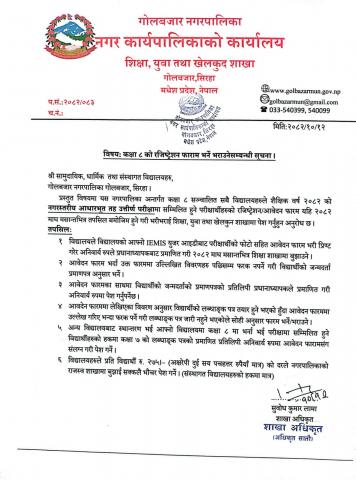 कक्षा-८ को रजिस्ट्रेशन फारम भर्ने भराउनेसम्बन्धी सूचना ।