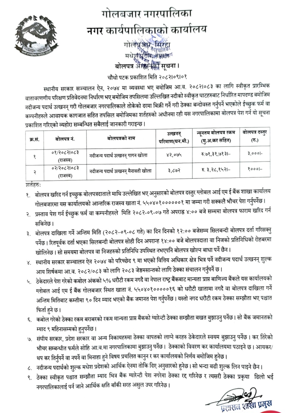 नदीजन्य पदार्थ उत्खनन् तथा संकलनको लागि बोलपत्र अह्वान सम्बन्धी सूचना ।