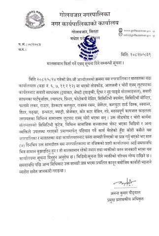 मालसामान फिर्ता गर्ने एवम् सूचना दिने सम्बन्धी सूचना ।