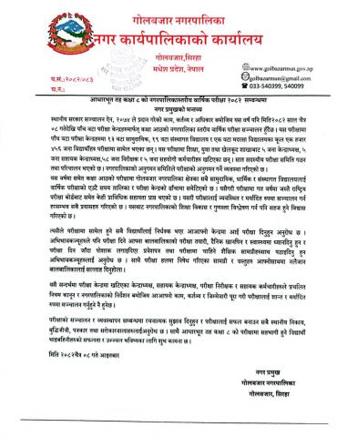 » आधारभूत तह कक्षा ८ को नगरपालिकास्तीय वार्षिक परीक्षा २०८२ सम्बन्धमा नगर प्रमुखको मन्तव्य ।