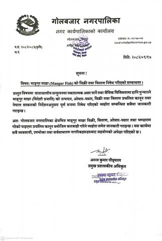 » माङ्गुर माछा (Mangur Fish) को बिक्री तथा वितरण निषेध गरिएको सम्बन्धमा ।