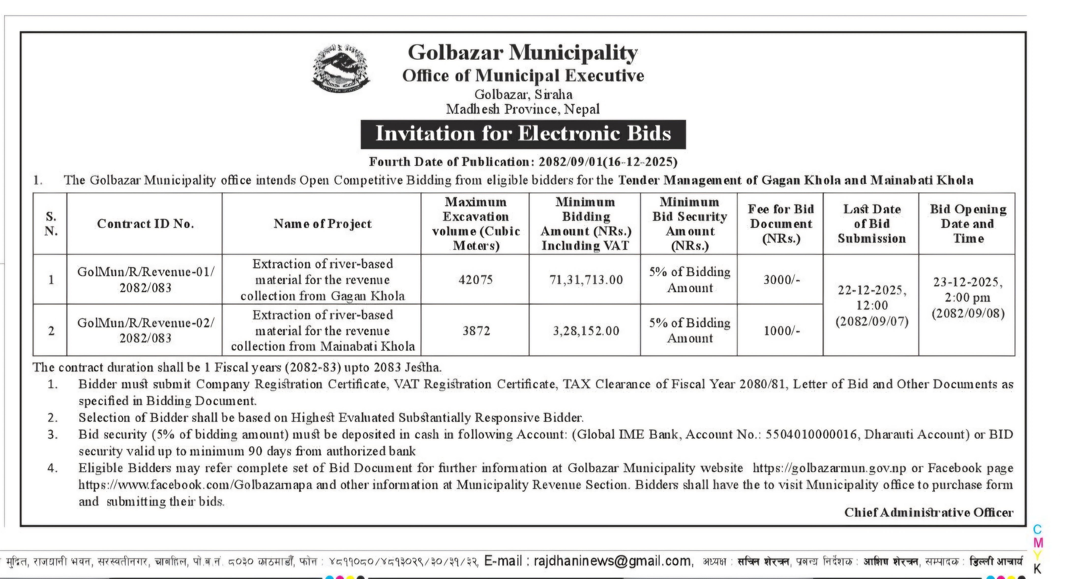 दोस्रो पटक गागन र मैनावती खोलाको नदीजन्य पदार्थको शुल्क संकलनको लागि बोलपत्र अह्वान सम्बन्धी सूचना ।