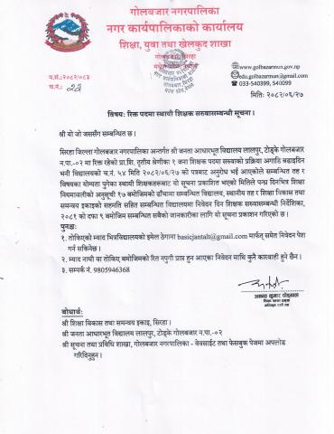 रिक्त पदमा स्थायी शिक्षक सरुवा सम्बन्धी सूचना ।