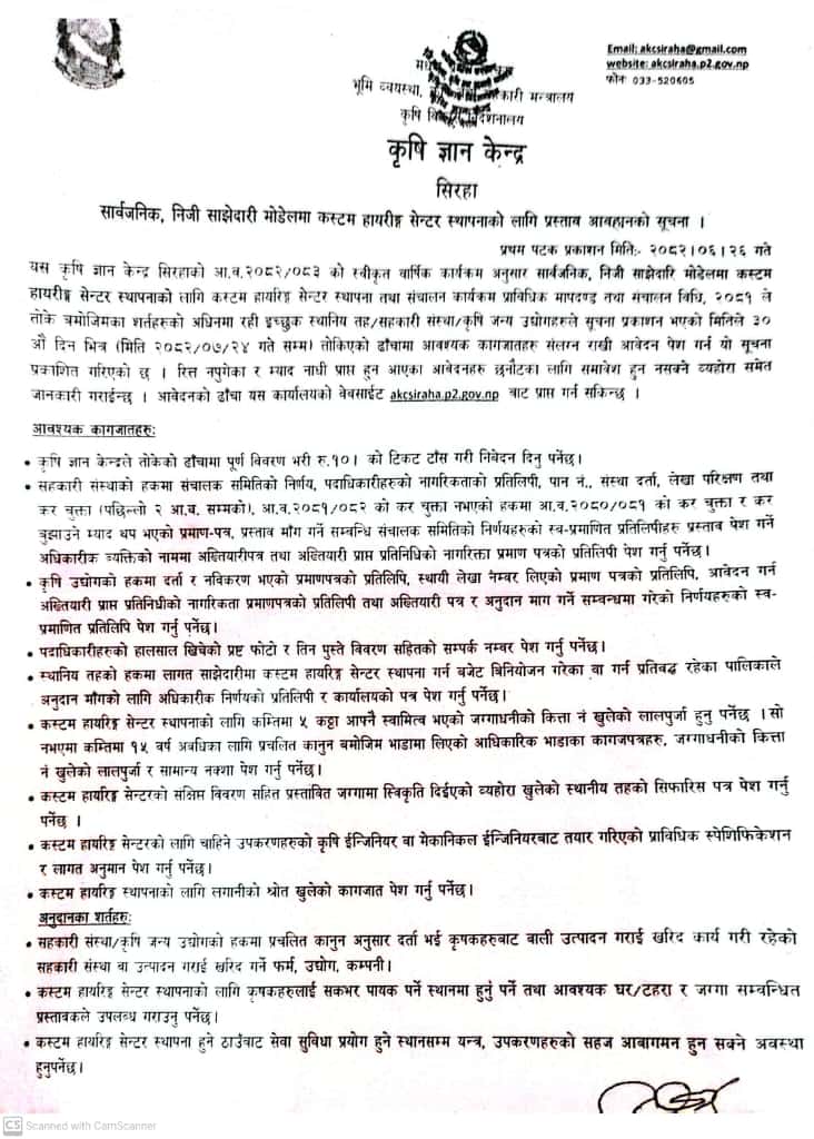 » सार्वजनिक, निजी साझेदारी मोडेलमा कस्टम हायरिङ्ग सेन्टर स्थापनाको लागि प्रस्ताव आवह्वानको सूचना ।