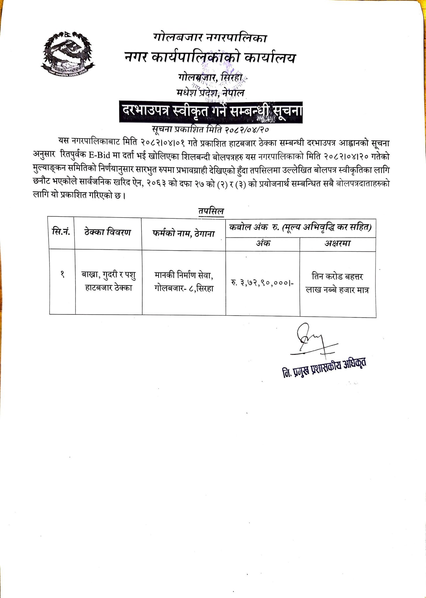 हाटबजार ठेक्का दरभाउपत्र स्वीकृत गर्ने सम्बन्धी सूचना ।